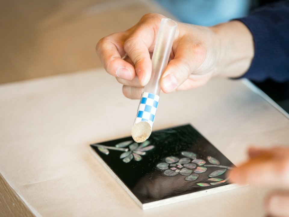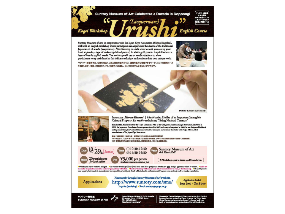 このワークショップは、日本の伝統工芸の中でも高度な技術を要する「漆芸(うるしげい)」に焦点をあて、重要無形文化財保持者(蒔絵)であり人間国宝である室瀬和美氏を講師に迎えて実施されたものです。