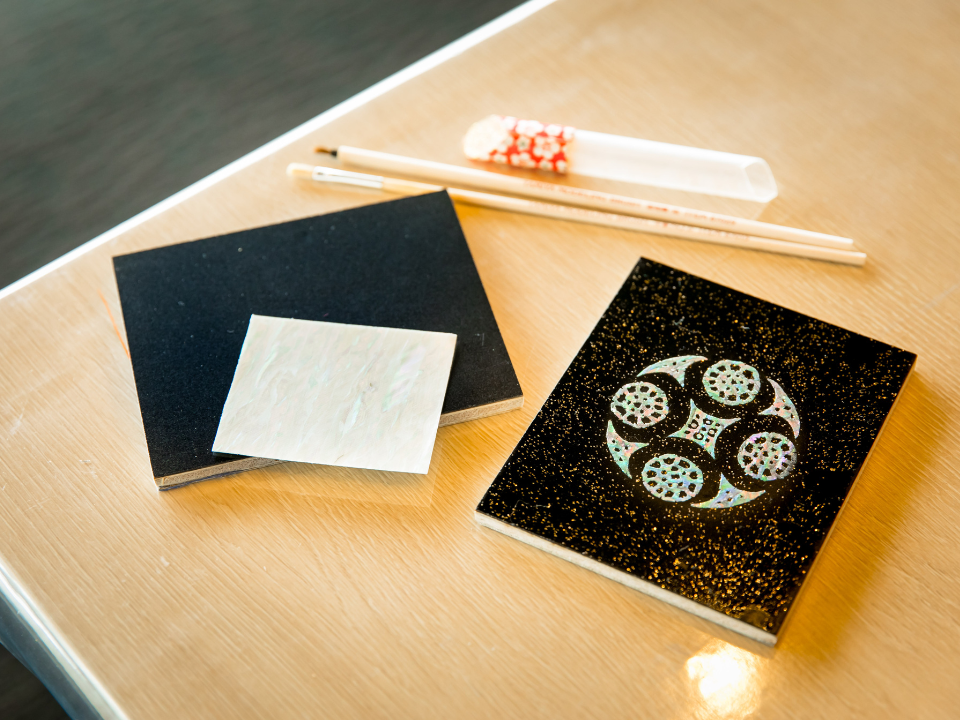 当日は、逐次通訳を交えての講演に加え、蒔絵技法の一つ「地蒔き(金粉を蒔く工程)」を体験。実際の漆を使わず、安全な材料で日本の伝統技術に触れ、自分だけのオリジナル作品を仕上げる内容で、文化体験として高い評価を得ました。